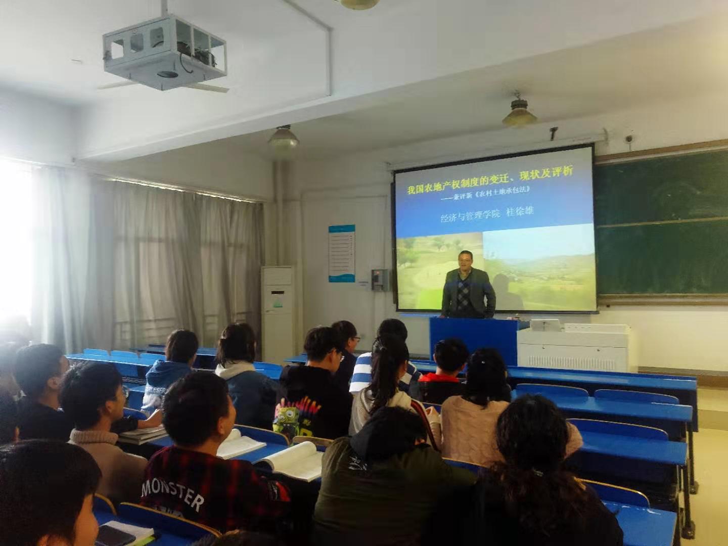 2019年11月13号上午,“行知学堂”系列学术讲座在锦绣校区逸夫楼301举行。本次讲座由正规滚球app平台官网桂徐雄老师主讲,题目是“我国农地产权制度的变迁、现状及评析——兼评新《农村土地承包法》”,2017级经济学专业的学生聆听了讲座。