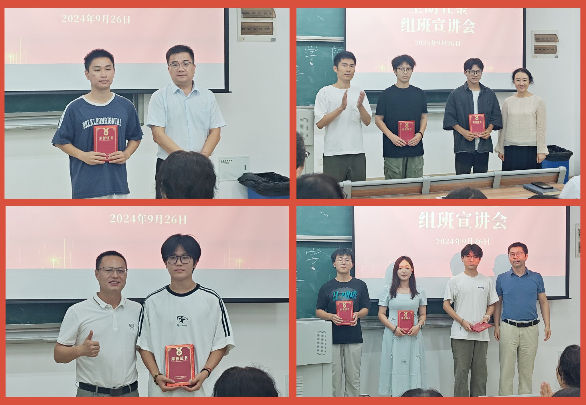 接着进入颁奖环节,陈好为一等奖学金获得者胡林鑫同学颁发证书及奖学金;陶敏为二等奖学金获得者凡远山、许灿同学颁发证书及奖学金;钟玉文为三等奖学金获得者何小雨、刘帅飞、凌健同学颁发证书及奖学金;戴成为赵乐乐同学颁发助学金。
