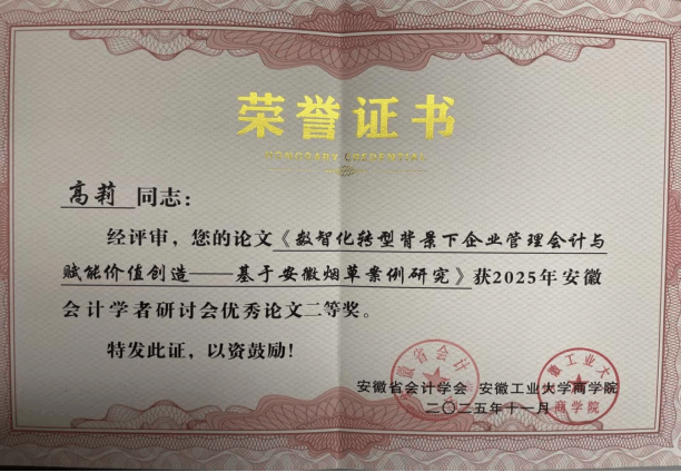 研讨会上,滚球官网高莉老师汇报了撰写的论文《数智化转型背景下企业管理会计与赋能价值创造—基于安徽烟草案例研究》。该论文围绕“数智化转型背景下的企业管理会计创新”展开深入研究,系统梳理了相关领域的研究现状,通过案例分析、实证研究等方法揭示了关键问题与解决路径。论文得到了与会专家的一致好评,荣获研讨会“优秀征文二等奖”。