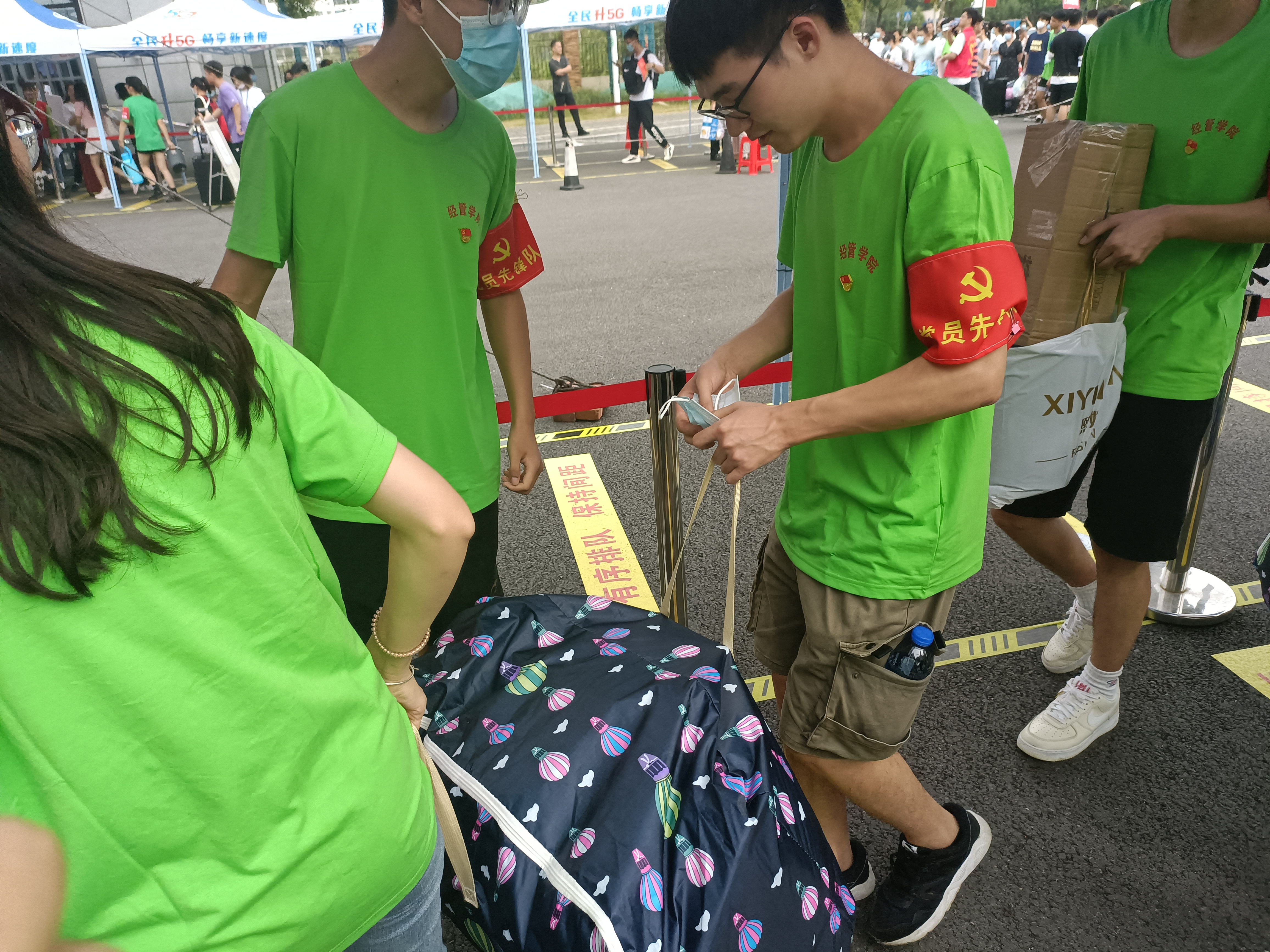 早上7时许,学院所有参与志愿服务的学生党员统一着装,佩戴党员徽章及袖章,亮明党员身份,乘坐大巴前往滨湖校区。他们分工明确,相互配合。党员作为志愿者,主要的工作是对报到新生进行引导,做好接待、引路、咨询、协助新生搬运行李等一系列工作。每位党员志愿者坚守岗位,让新生们切实感受到了正规滚球app平台官网大家庭的温暖。醒目的绿背心成为迎新现场一道流动着的靓丽风景线。