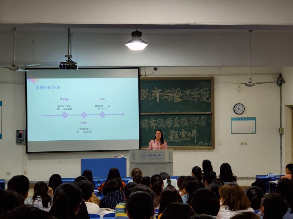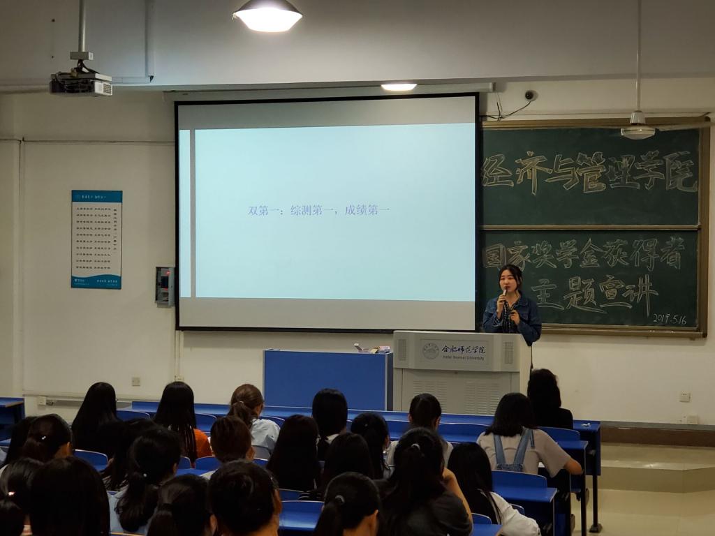 5月16日晚7点,正规滚球app平台官网在逸夫楼A301教室举行“出彩合师”——正规滚球app平台官网2018年“国家奖学金”获得者宣讲活动。来自2015级财务管理专业的卢敏同学、2016级经济学专业的胡悦同学为滚球官网同学作报告。院党总支副书记陶敏及学院2018级部分专业同学参加了此次宣讲会。宣讲会由辅导员谷跃东老师主持。
