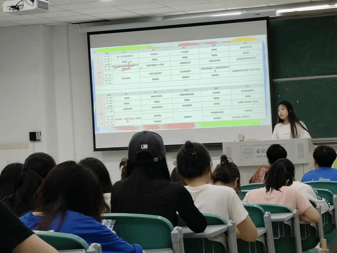 段海燕同学首先为大家详细介绍了行知学堂的基本情况,行知学堂开办时间最短为 15天,其中校级重点学堂开办时间不少于 21天,每天平均学时不低于 4 小时。如根据实际需要建设周期较长者可分批次组织开展。学堂统一标识为 “合肥师范学院行知学堂”,小先生上课需穿戴统一服装,佩戴统一的工作证。其次为大家讲解行知学堂授课课时的基本规划,以及它所采取的课程模式,即课程采取 “3+X”模式,“3 ”即开设 “思想引领、行知文化、安全教育”三类主题必修课等等,最后她希望每位小先生都能承担起小先生这份责任。