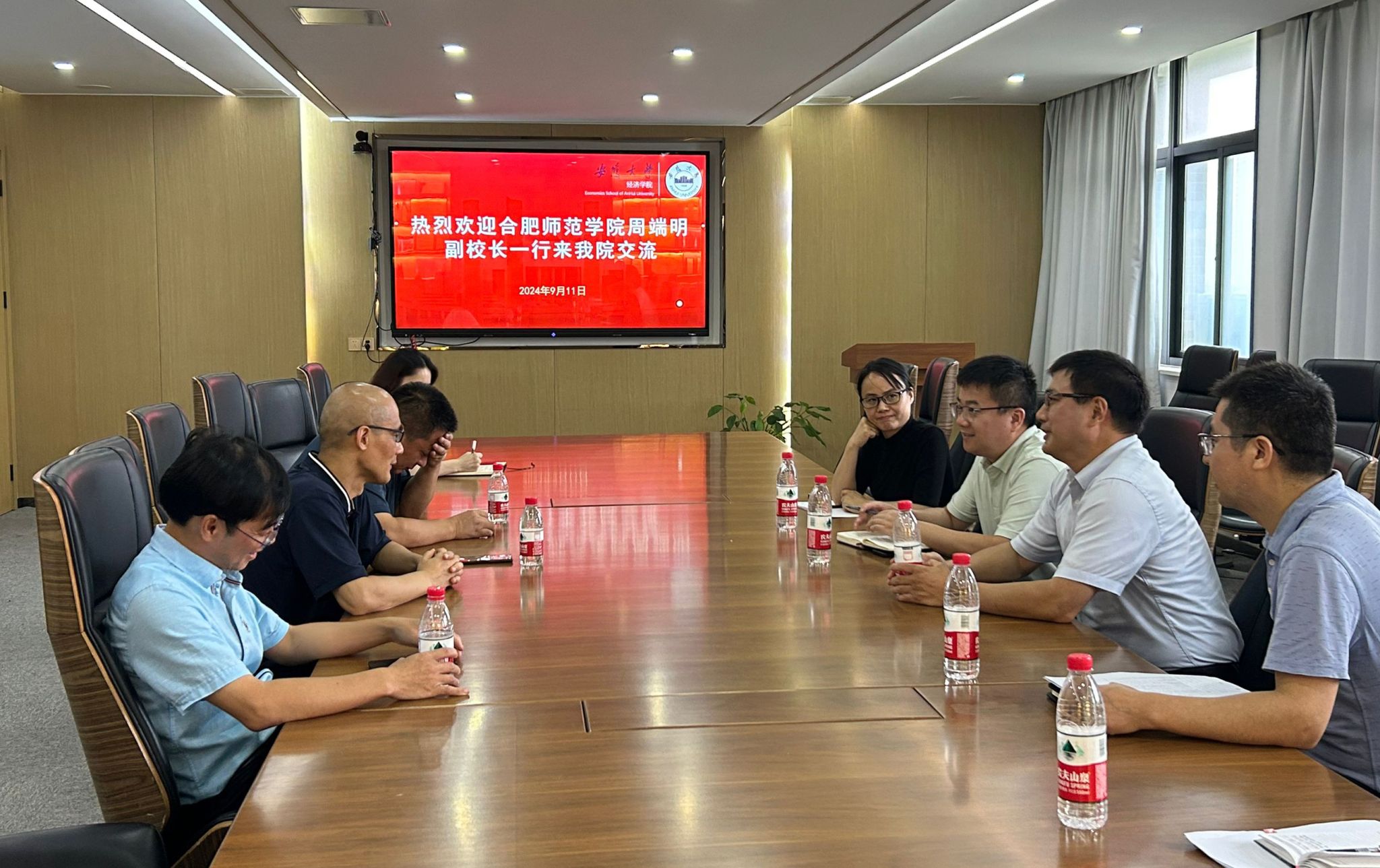 为加强与省内兄弟院校的交流,学习先进经验和做法,推动学院高质量发展。9月11日下午,正规滚球app平台官网班子成员及骨干教师在校党委委员、副校长周端明带领下赴安徽大学经济学院进行学习调研。安徽大学经济学院执行院长徐亚平、副院长华德亚、杨仁发热情接待了周端明一行。双方围绕应用型办学转型、学科专业建设与调整、硕士生培养等方面的内容进行了深入交流。