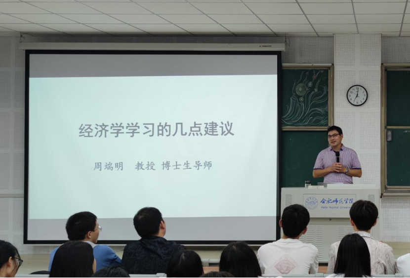 报告开始,周端明亲切地和同学们分享了他的求学经历。随后,周端明从“经济学是一门致用之学”、“经济分析需要更多学科知识”和“学好经济学意味着能够更深入理解经济社会”三个方面向同学们讲解了经济学专业内容,通过举例分析不同时代的经济现状,解释政府在如何控制社会总需求供给方面促进国家经济的发展。同时给同学们推荐经典经济学著作,如亚当斯密《国民财富的性质与原因研究》、马克思《资本论》第一卷、《经济学原理》和凯恩斯《就业、利息和货币通论》,帮助同学们更好了解经济学原理与知识。