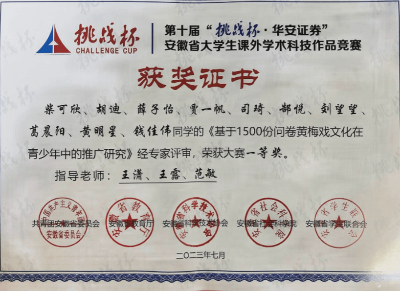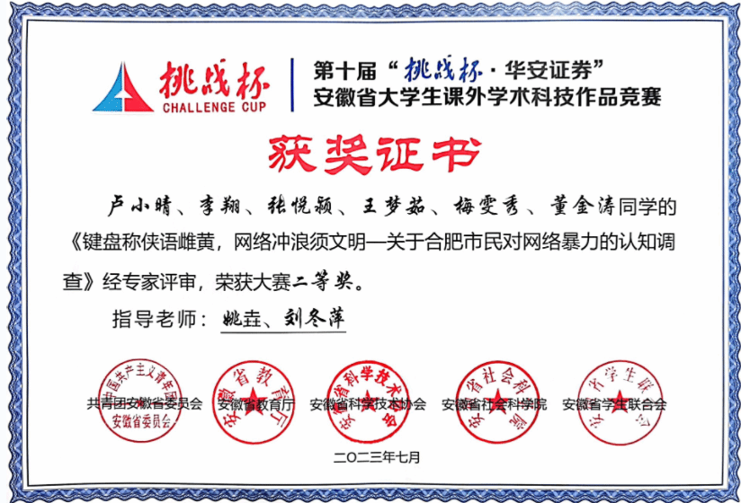 经过公开展示、答辩等环节激烈角逐,正规滚球app平台官网柴可欣、胡迪、薛子怡、贾一帆、司琦、郜悦、刘望望、葛晨阳、黄明星、钱佳伟同学的《基于1500份问卷黄梅戏文化在青少年中的推广研究》(哲学社会科学类调查报告,指导教师为王潇、王露、范敏),获省赛一等奖;正规滚球app平台官网卢小晴、李翔、张悦颍、王梦茹、梅雯秀、董金涛同学的《键盘称侠语雌黄,网络冲浪须文明—关于合肥市民对网络暴力的认知调查》(哲学社会科学类调查报告,指导教师为姚垚、刘冬萍),获省赛二等奖。