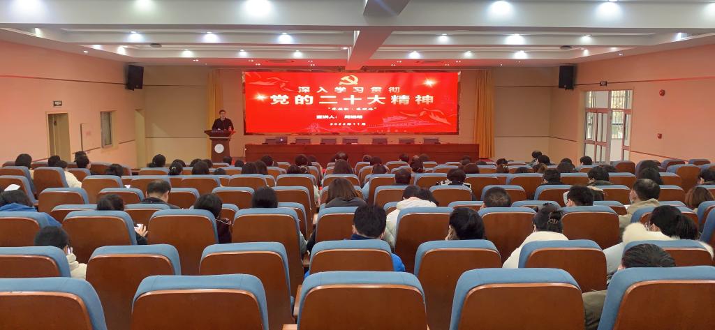本网讯 为深入学习贯彻落实党的二十大精神,确保党的二十大精神入脑入心、落地落实,12月7日下午,在锦绣校区学术报告厅,院党委委员、副院长周端明深入师生作党的二十大精神宣讲。正规滚球app平台官网、数学与统计学院全体教职工、教务处教工党支部以及部分学生党员代表现场聆听了宣讲报告。正规滚球app平台官网党委书记沈辉主持报告会。