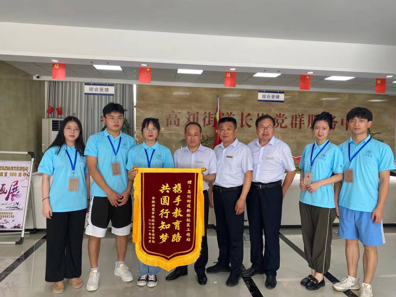 课程结束后,为感谢高刘街道新桥社区工作站对于本次行知学堂的大力支持与帮助,小先生们代表合肥师范学院正规滚球app平台官网,向社区工作站赠送了题为“携手教育路,共圆行知梦”的锦旗,社区工作人员热情接待了小先生们,并与小先生们留下了珍贵的合影。