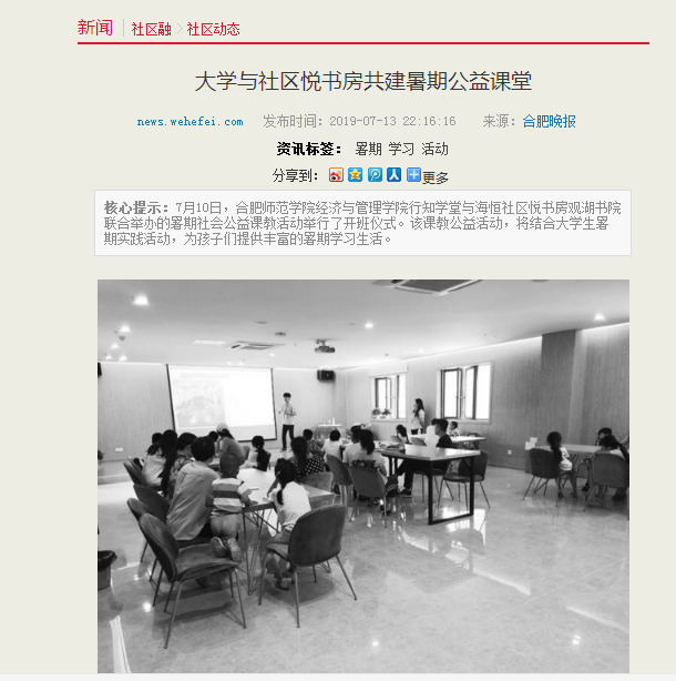 7月13日,合肥晚报、合肥在线报道滚球官网海恒社区行知学堂志愿服务活动。(正规滚球app平台官网)