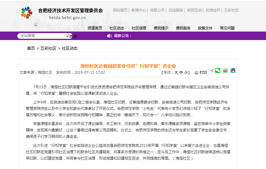 7月15日,合肥经济技术开发区管委会官方网站报道滚球官网清华启迪科技园“行知学堂”实践活动。(正规滚球app平台官网)
