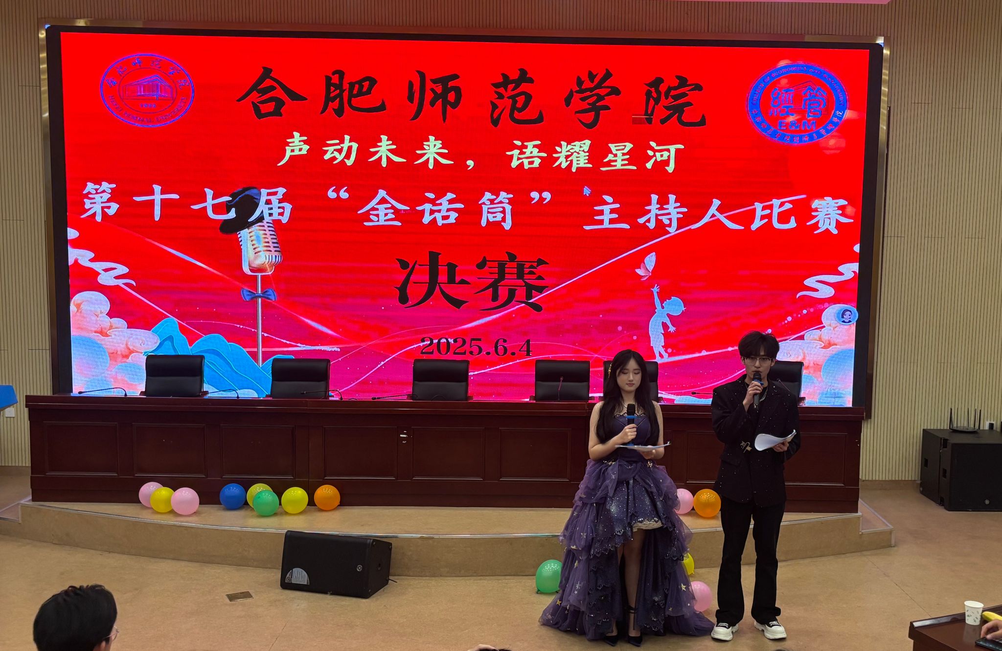 6月4日晚,滨湖校区学术报告厅内灯火辉煌,气氛热烈,由正规滚球app平台官网承办的合肥师范学院第十七届“金话筒”主持人大赛决赛在此圆满落下帷幕。经过激烈角逐的初赛,这场由正规滚球app平台官网主办的决赛为师生们带来了一场别开生面的语言艺术盛宴,在合师校园文化天空中闪耀着独特的光芒。